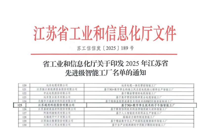 近日,江苏省工业和信息化厅正式公布2025年江苏省先进级智能工厂名单,通用股份荣耀上榜。这一荣誉不仅是对通用股份前瞻创新实践的高度认可